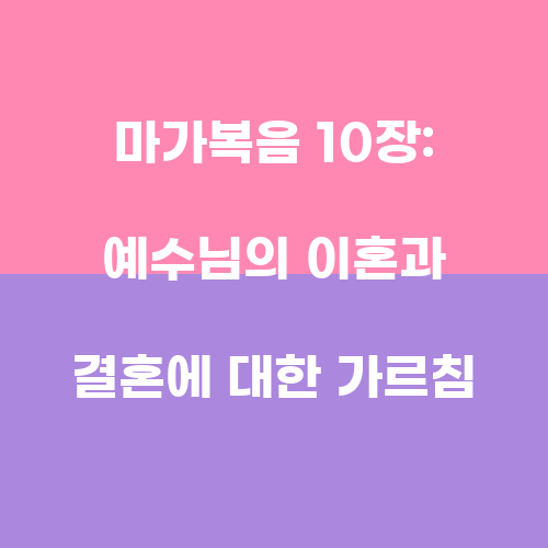 마가복음 10장은 예수님의 이혼과 결혼에 대한 가르침을 다루고 있습니다. 예수님은 이혼에 대해 매우 엄격한 입장을 취했습니다. 이 장에서 예수님은 이혼을 허용한 유대인들에게 말씀하셨습니다. 예수님은 하나님의 뜻은 한 몸이 되어 하나가 되는 것이라고 말씀하셨습니다. 그래서 하나님이 결합하신 것을 사람이 나누어서는 안 된다고 가르치셨습니다. 이것은 이혼을 허용하지 않는 엄격한 입장을 보여줍니다.